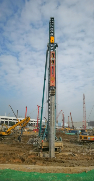新兴产业园项目基坑深度7.2米,基坑面积约21654m2,基坑周长约638m,基坑采用悬臂式PCS750(420)空心支护桩,结合桩顶局部放坡(东侧场地开阔处采用大放坡)的支护形式。支护桩的顺利完成,为下一步第二层土方开挖打下良好基础。